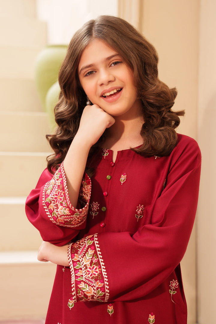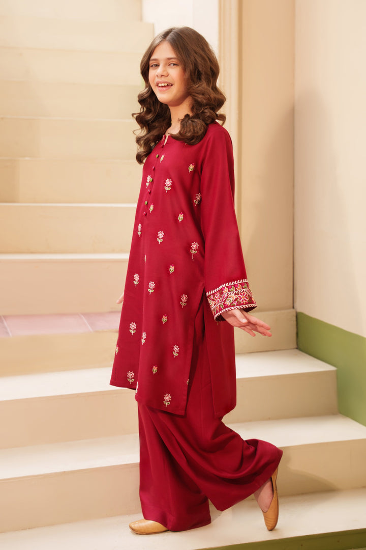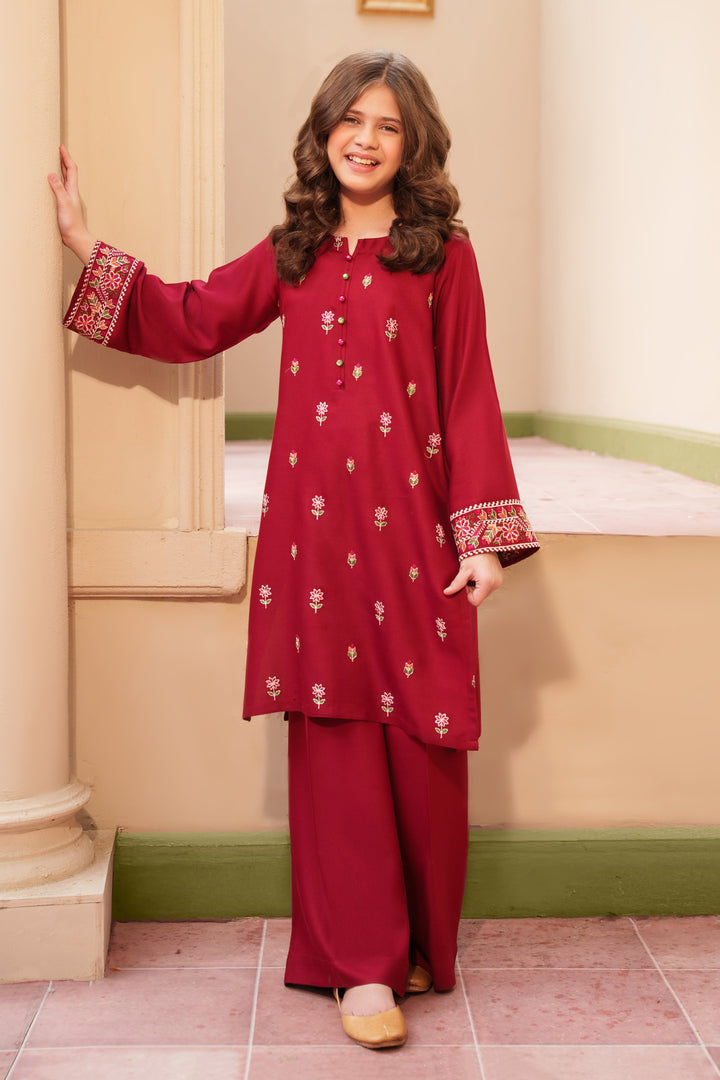 Bright, cozy, and beautifully designed, this embroidered 2-piece Dhanak suit is the perfect winter wear for your little girl. The rich maroon shade paired with delicate floral embroidery adds a classic festive touch, making it ideal for casual days, family gatherings, and winter outings.