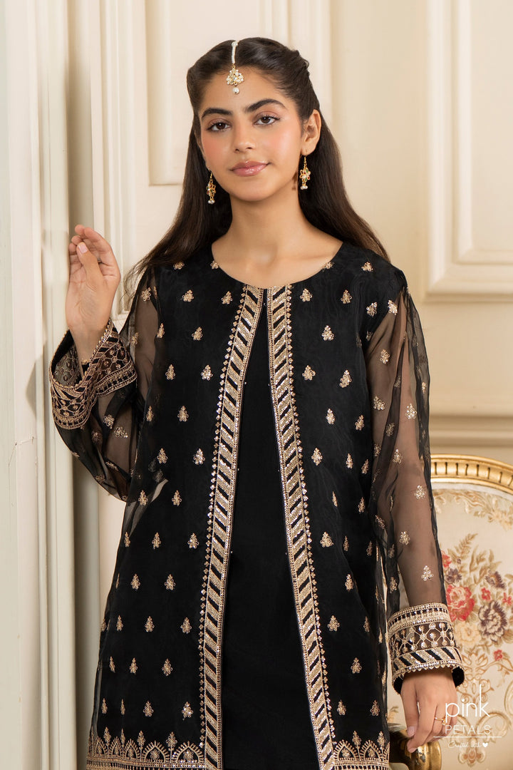 This look features a organza gown exquisitely adorned with tilla and sequins embroidery, paired with a sleek raw silk camisole and embroidered culottes for an effortlessly regal finish.