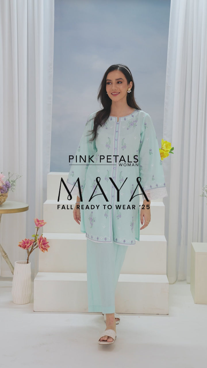 Dyed with embroidered front panel, Dyed back panel, Round neckline with a slit and embellished with Pearls, Full sleeves.