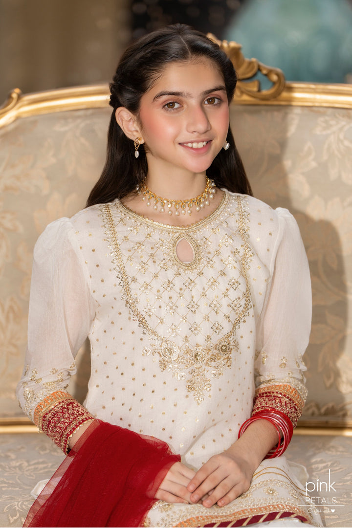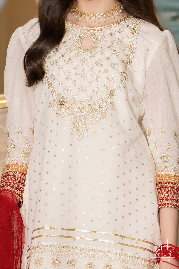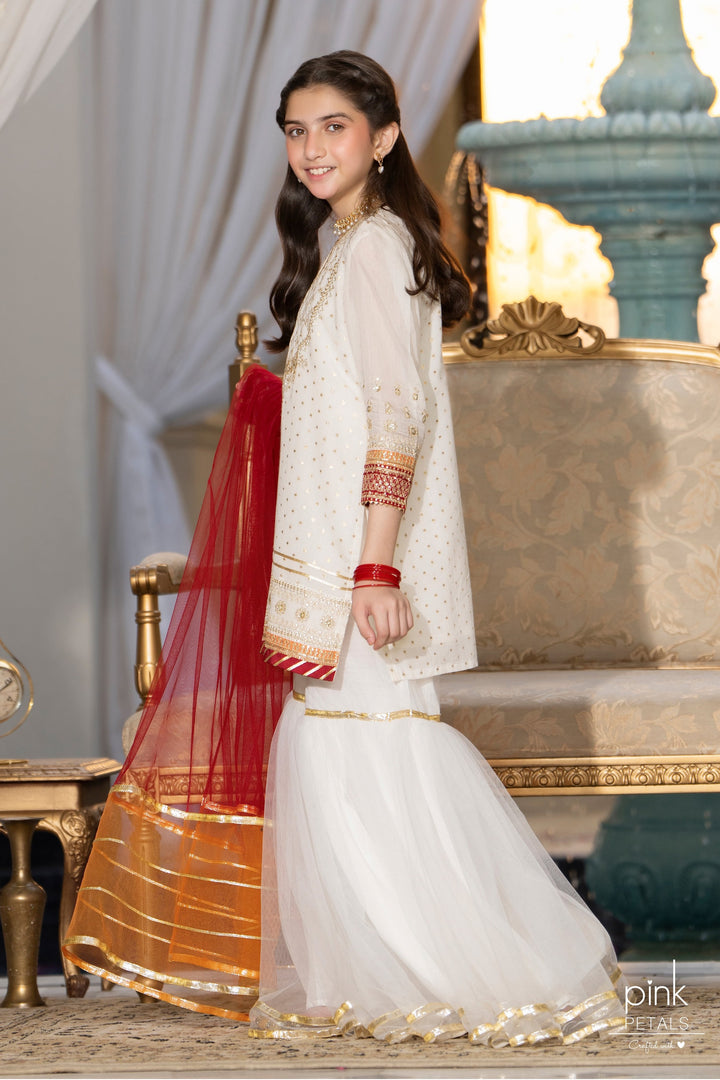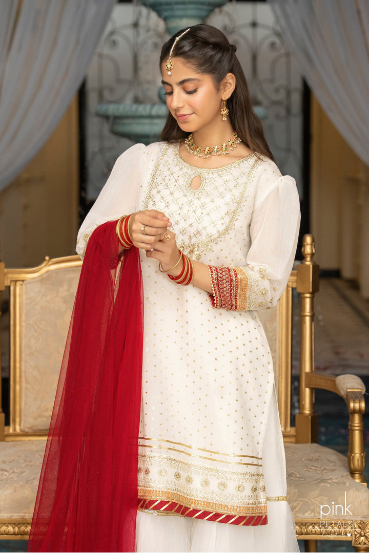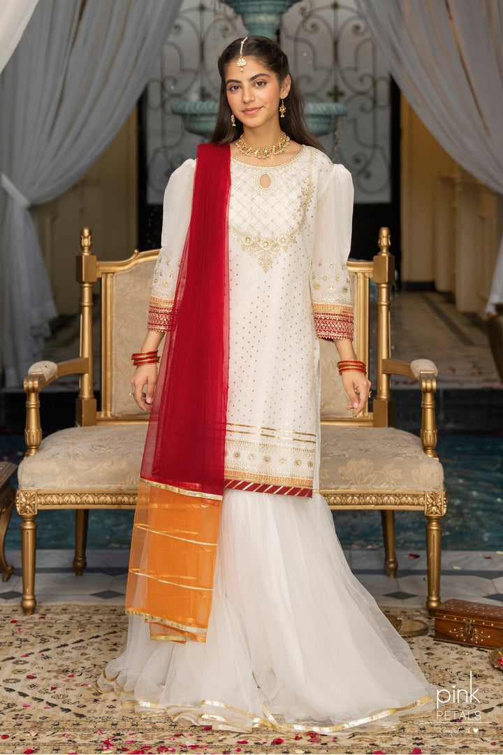 Dupatta: Sheer breeze net, delicately finished with traditional gotta detailing.