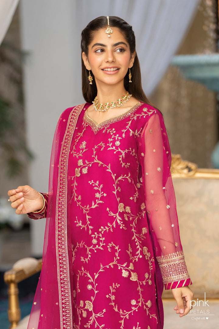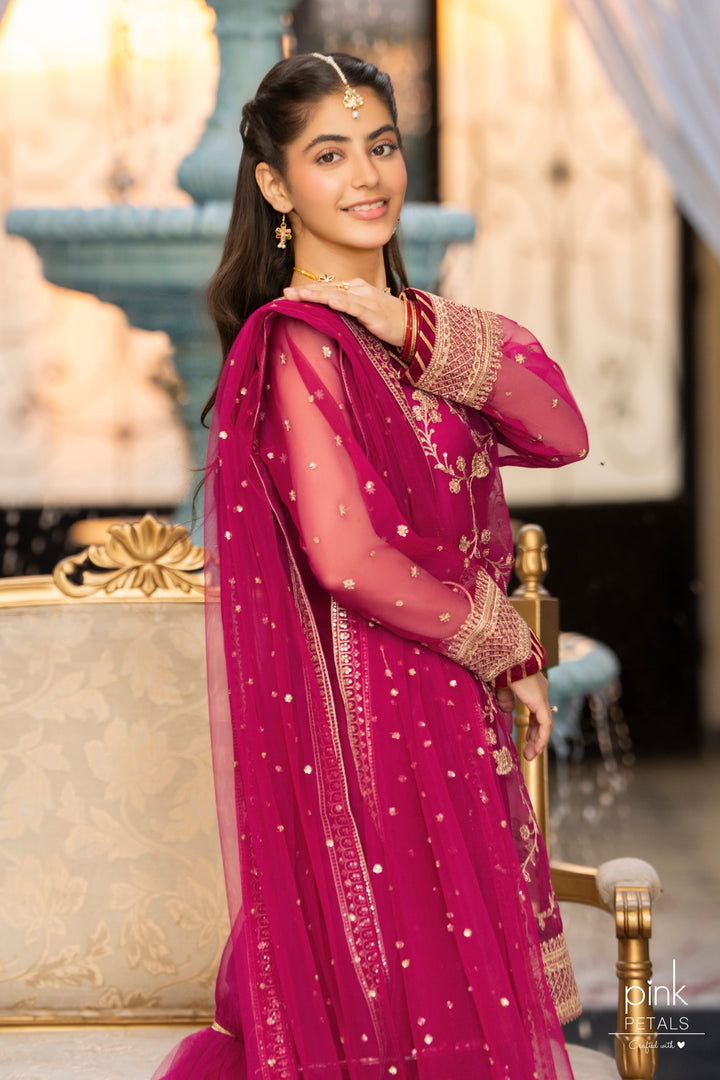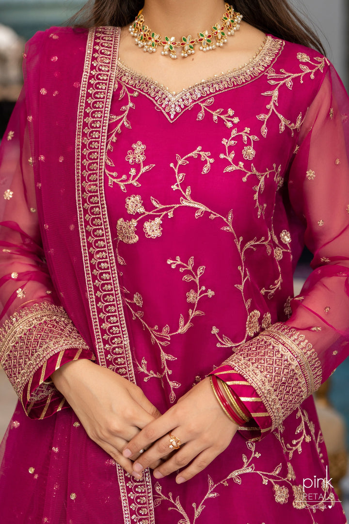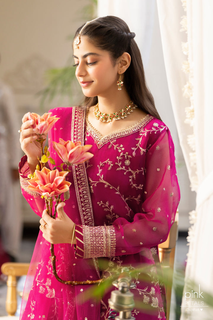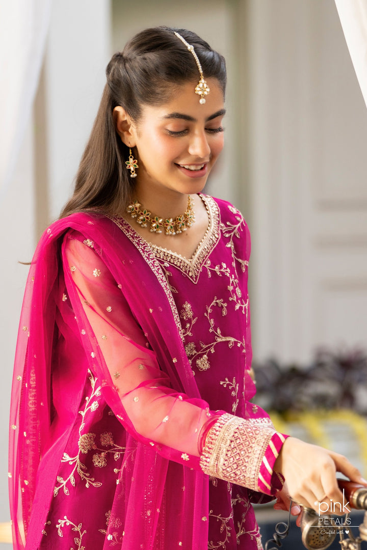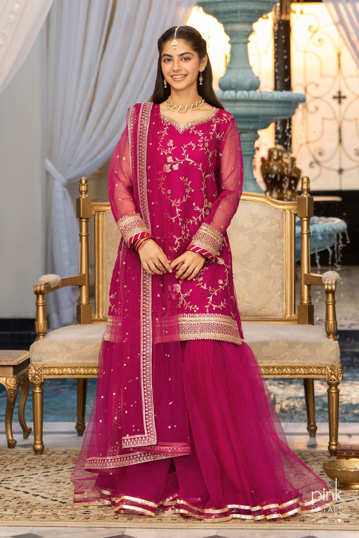 Radiate opulent charm in this Plum 3-piece masterpiece, exquisitely tailored to perfection. The ensemble features an organza shirt adorned with intricate embroidery, paired with a breeze net gharara and an embroidered breeze net dupatta that completes the look with effortless sophistication. A true embodiment of timeless luxury and grace.