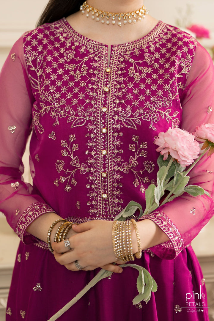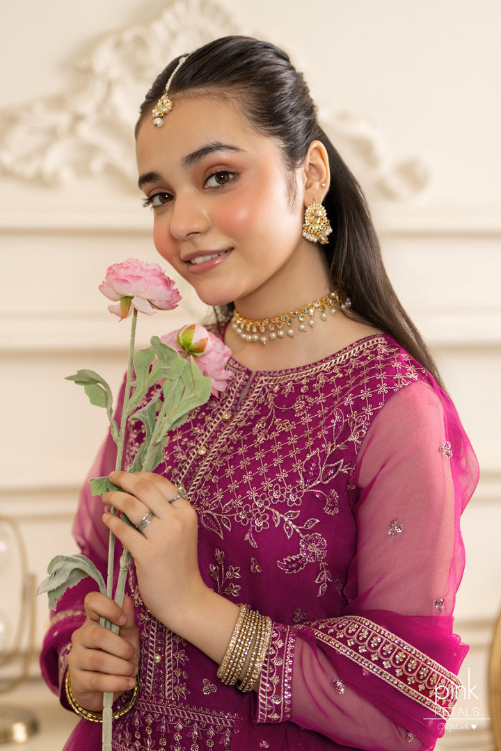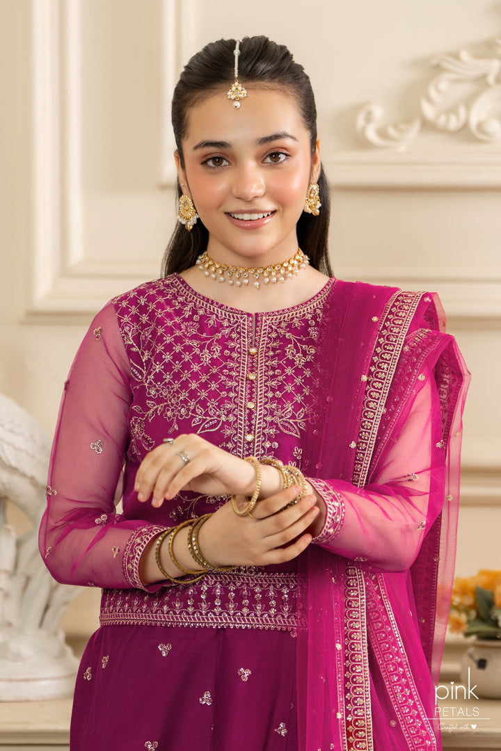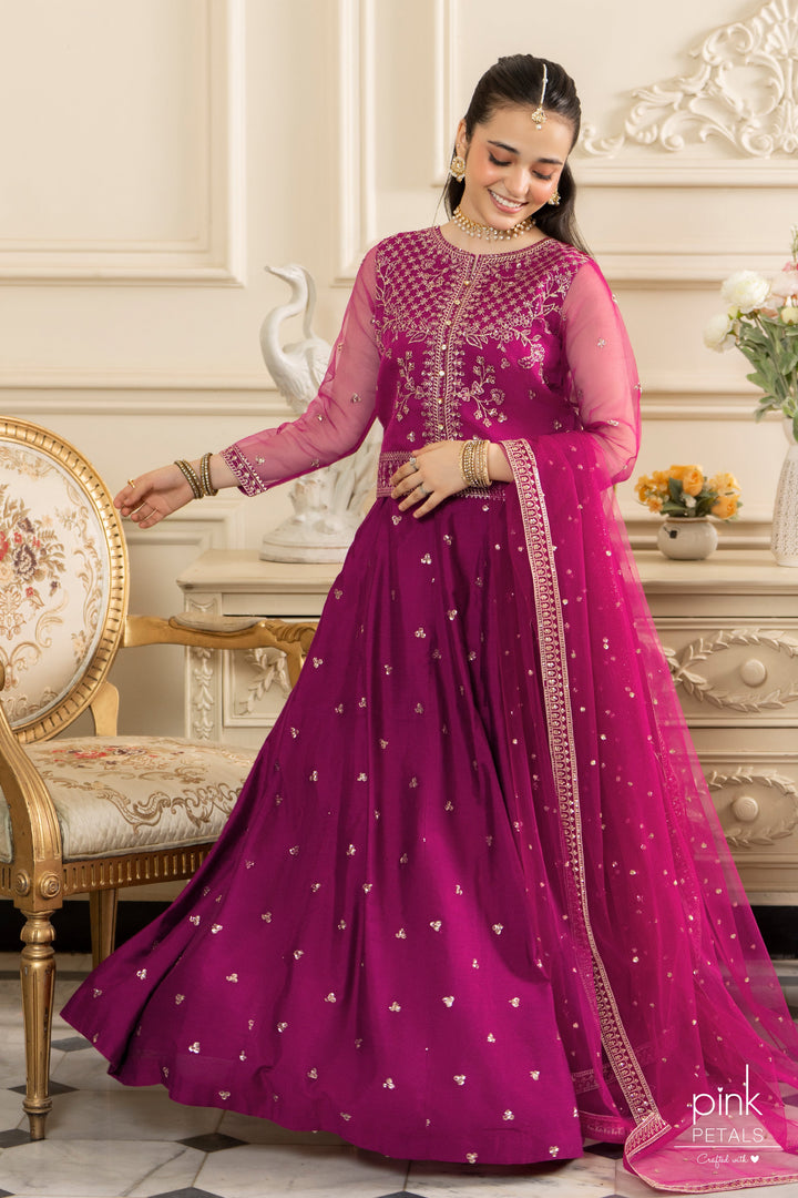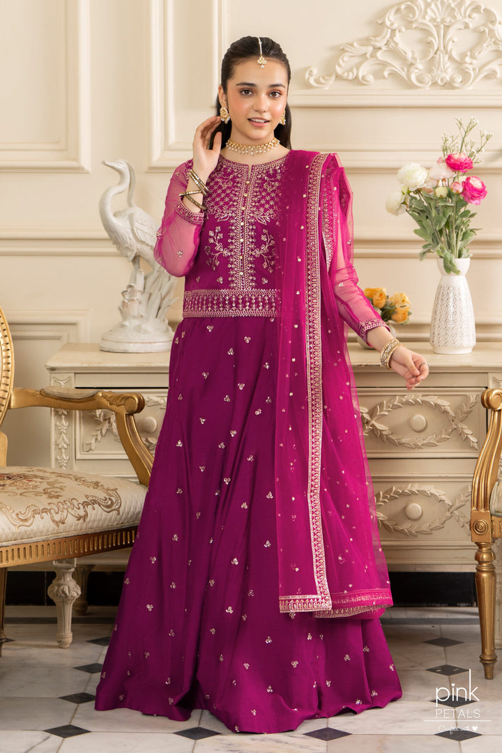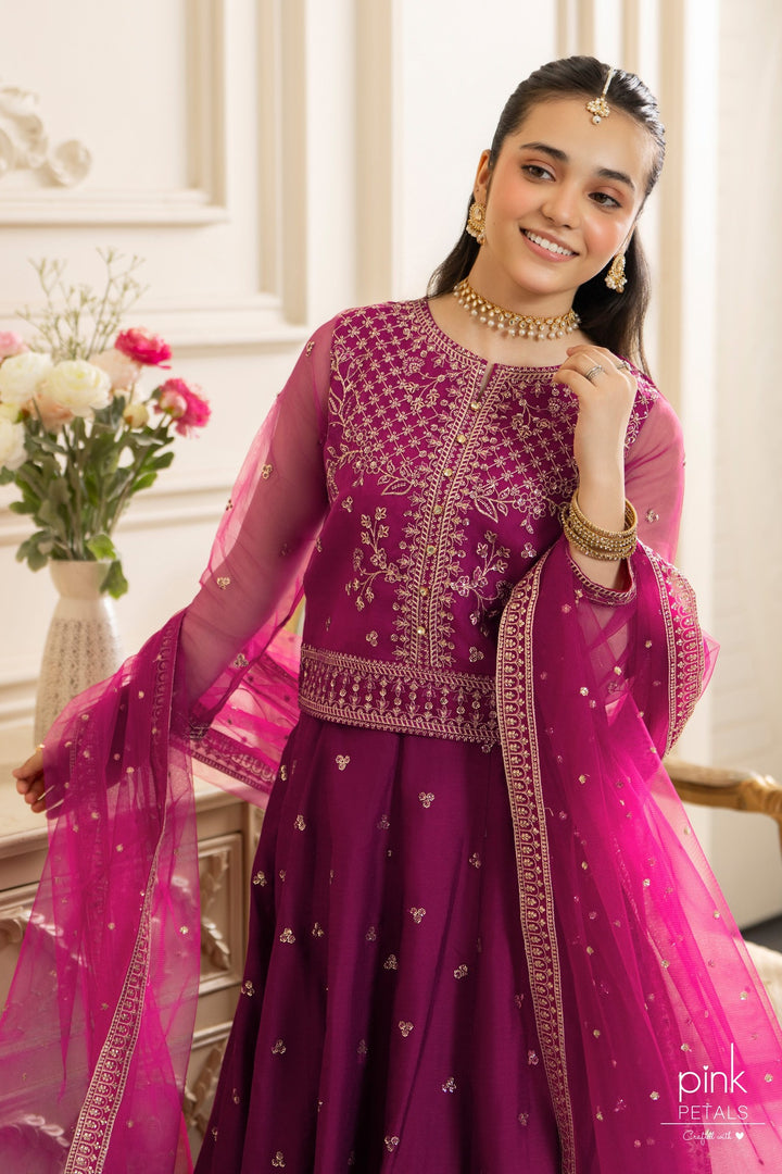 Embrace festive elegance in our stunning Plum ensemble, meticulously crafted to exude grace and celebration. The look features an organza choli embellished with sequins and tilla embroidery, paired with an embroidered cotton silk lehenga and a breeze net dupatta beautifully finished with an embroidered border.