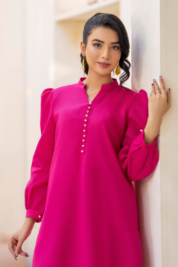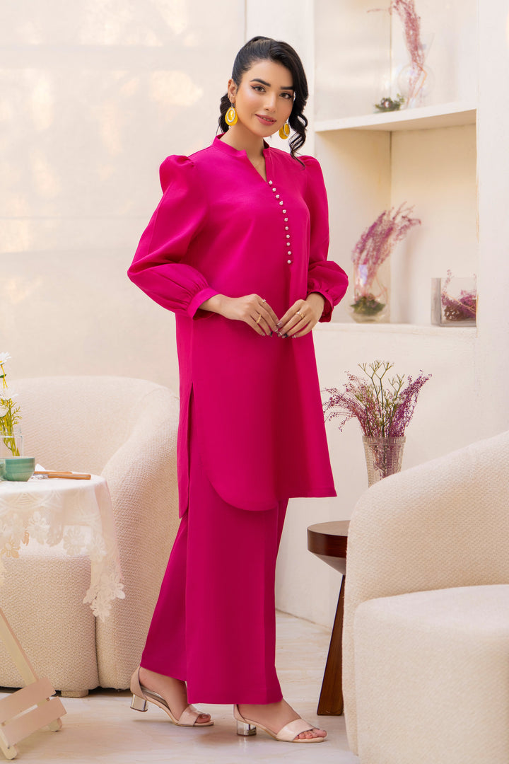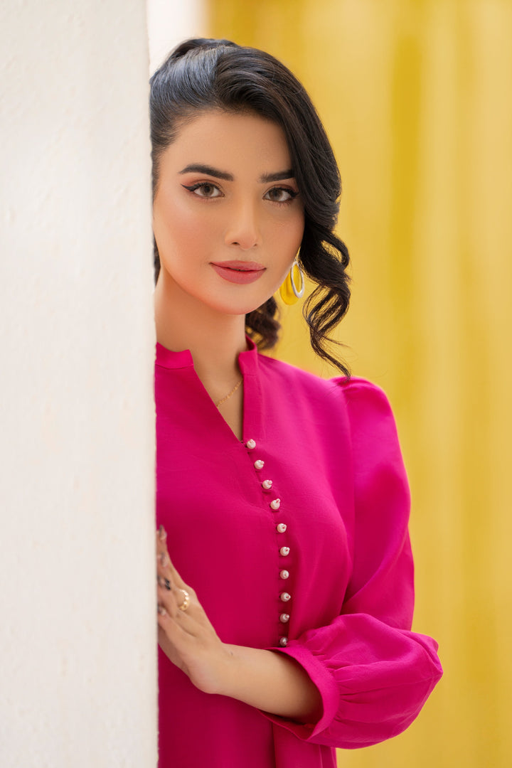 Embrace refined elegance in this fuchsia pink shirt featuring a rounded hem and a band neckline embellished with pearl buttons. Paired with matching culottes, it creates a graceful and timeless look.