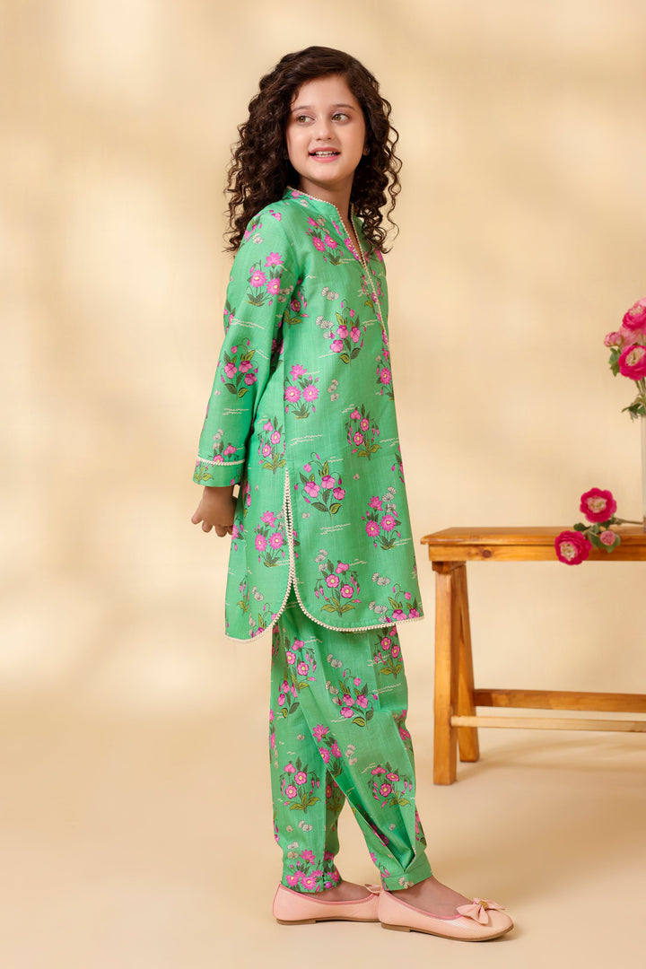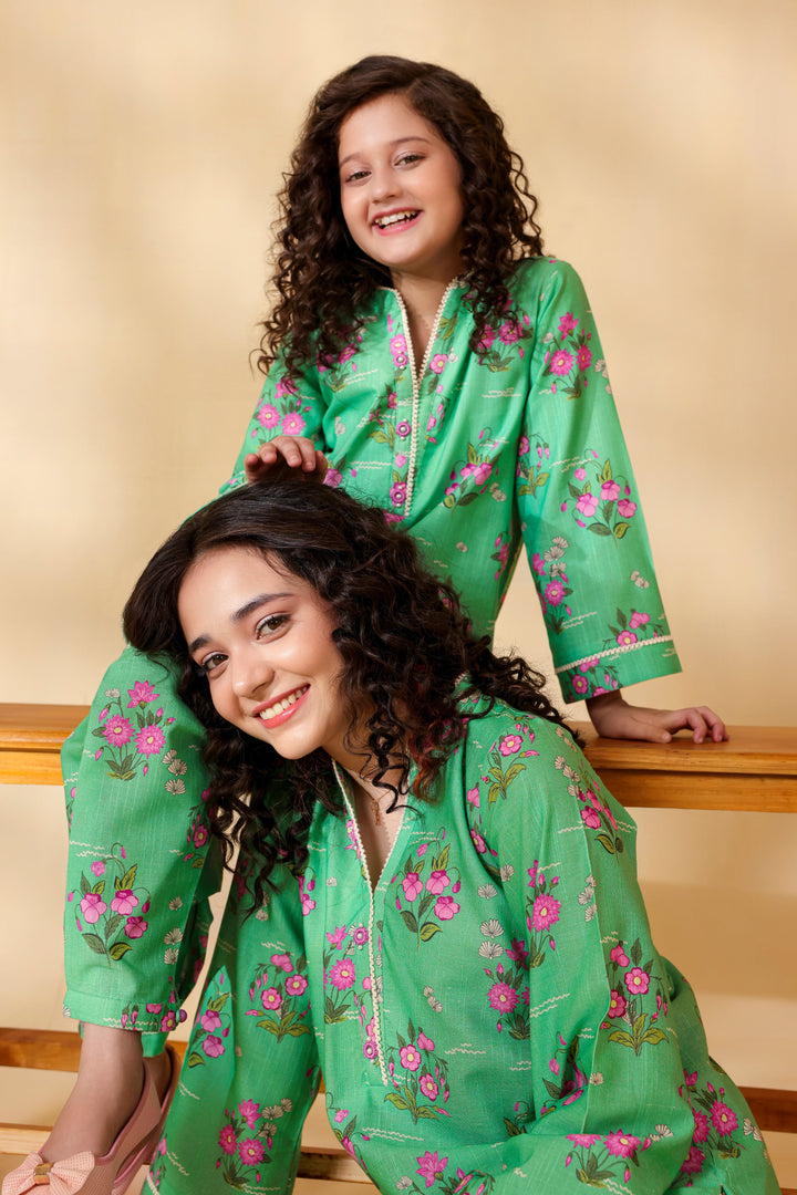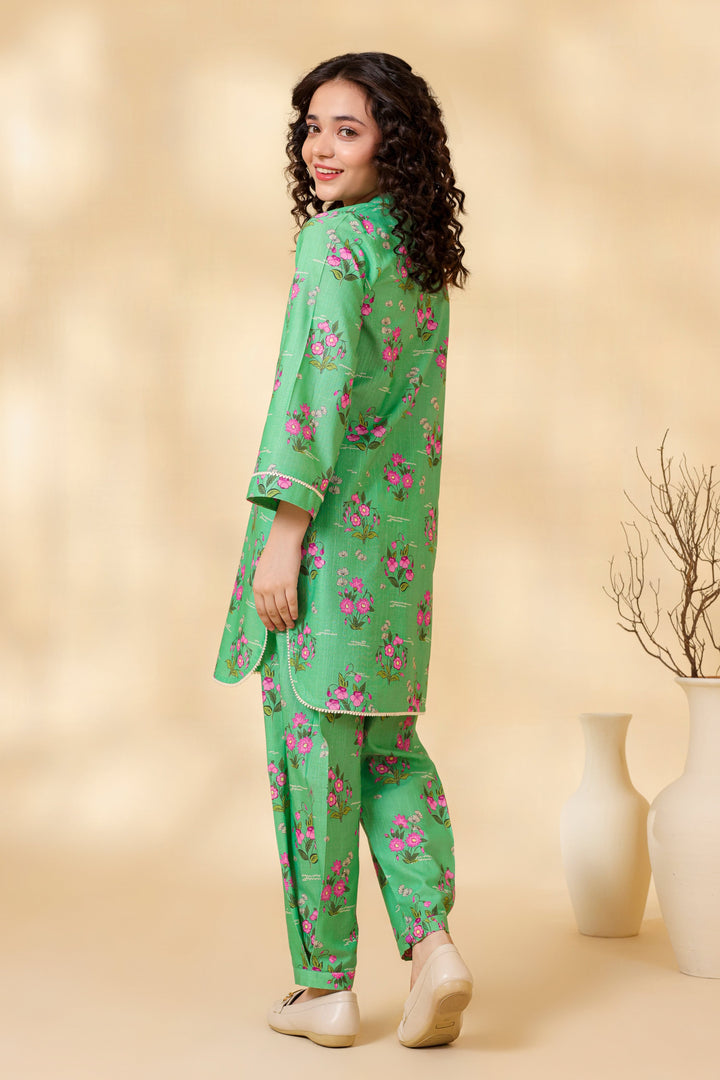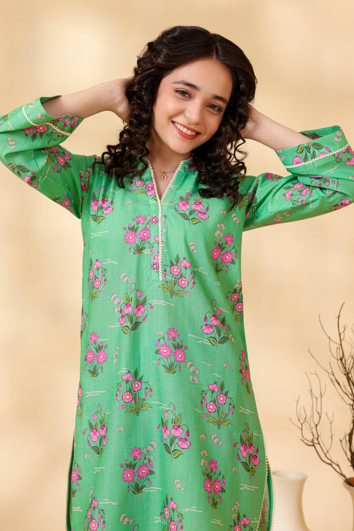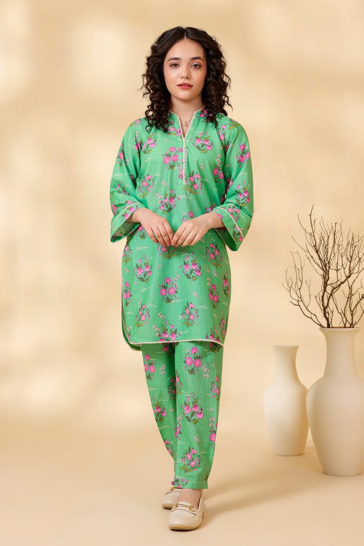 Brighten up your everyday look with this refreshing green two-piece khaddar suit.The shirt is styled with a straight silhouette, round neckline with a front slit, and relaxed sleeves for an easy fit. Paired with matching printed trousers, it creates a cohesive and stylish look perfect for casual wear or winter days.