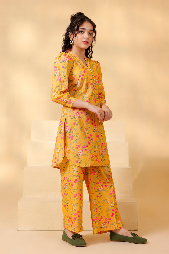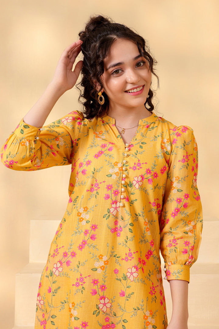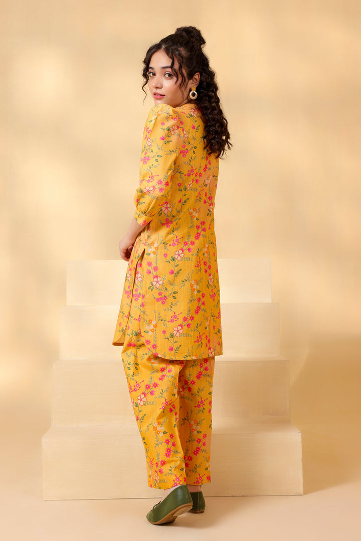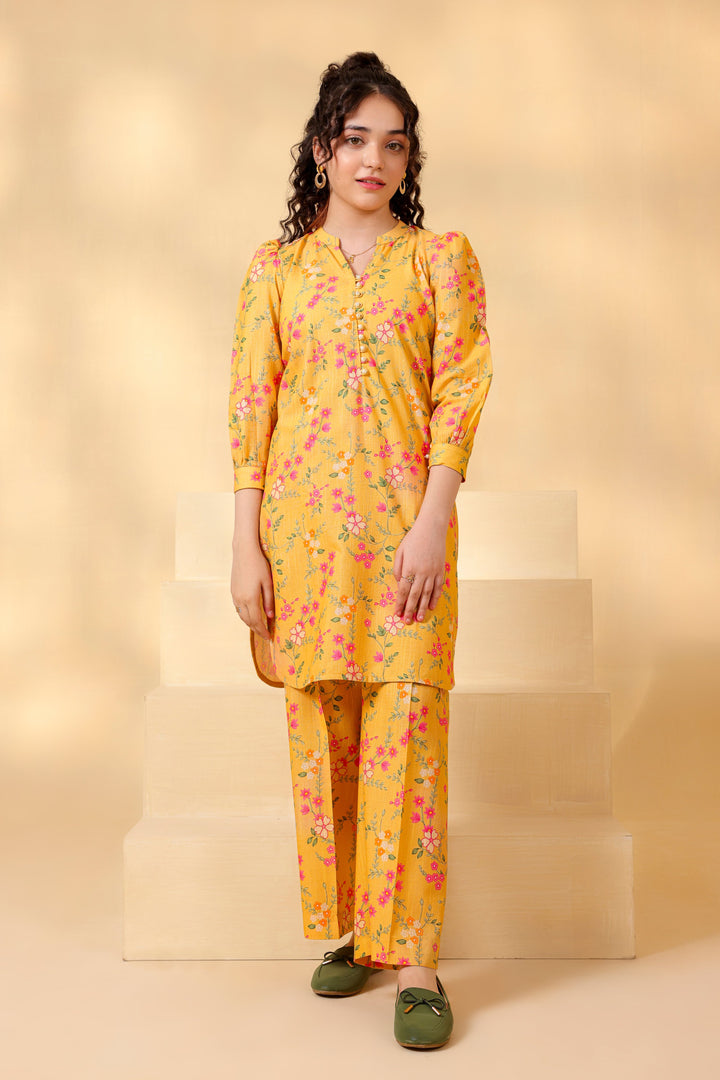 Brighten your winter wardrobe with this vibrant yellow floral printed 2-piece khaddar suit. Crafted from soft winter khaddar, this outfit offers warmth, comfort, and effortless style. The refreshing floral pattern in pink and green adds a cheerful and feminine touch to your look.