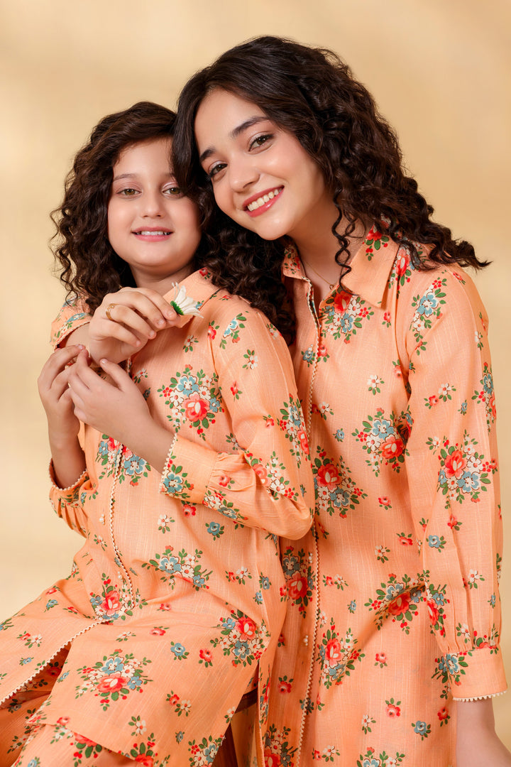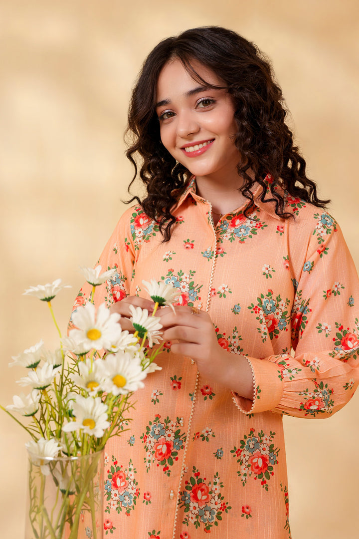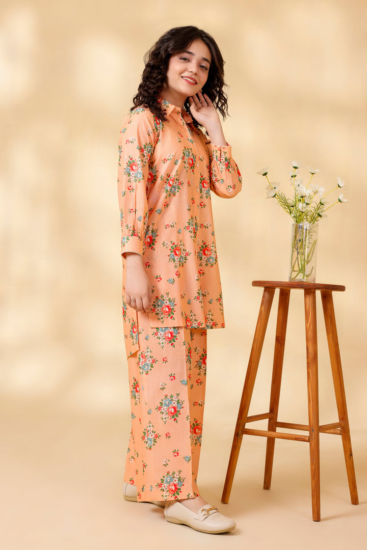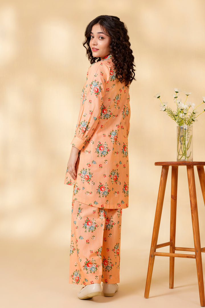 Add a pop of charm to your little one’s wardrobe with this adorable printed 2-piece khaddar suit. Its designed in a soft peach tone with a beautiful floral pattern, this outfit offers both comfort and style for the winter season. The shirt features a button-down front with delicate detailing, paired with matching straight trousers for a complete coordinated look your child will love.